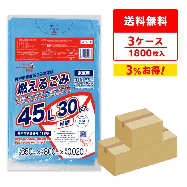 【まとめて3ケース】SKBK-60-3 神戸市指定袋家庭用 増量タイプ 可燃 45リットル 0.020mm厚 青 30枚x20冊x3箱/ ゴミ袋 ごみ袋 送料無料