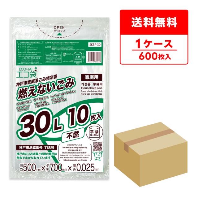 神戸市指定ごみ袋 家庭用燃えないごみ袋 不燃 30リットル 0.025mm厚 透明 10枚x60冊 SKBF-30 / まとめ買い お得 ポリ袋 ビニール袋 神戸市指定袋 もえないゴミ 30L サンキョウプラテック 送料無料