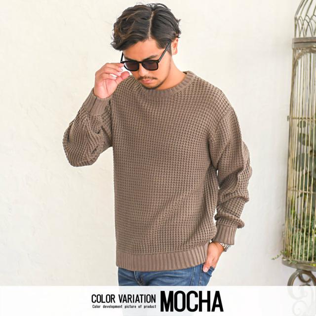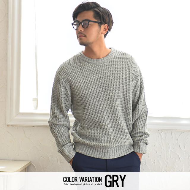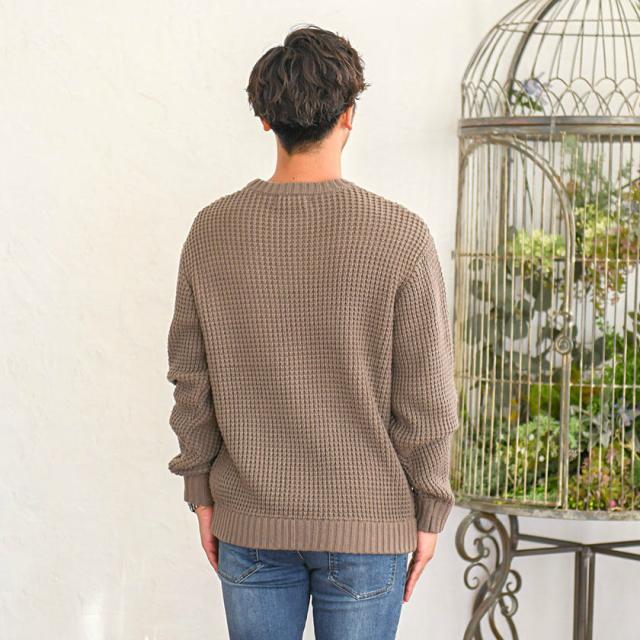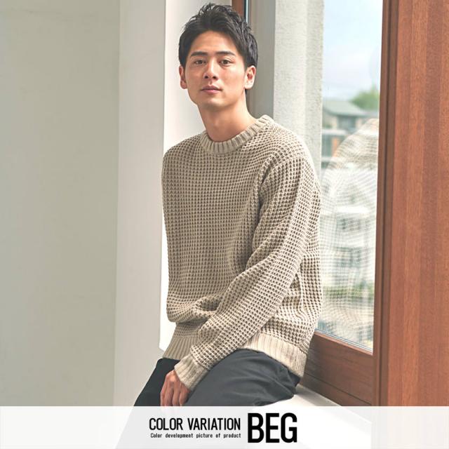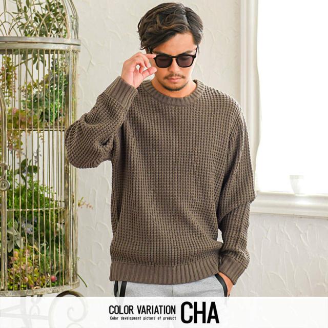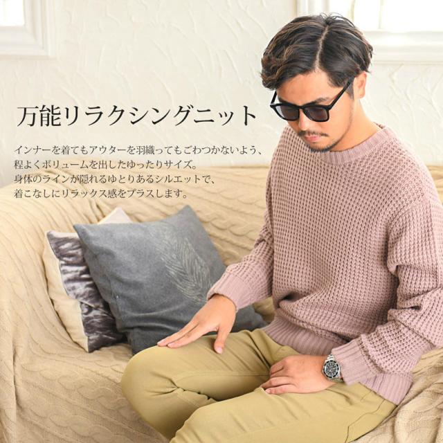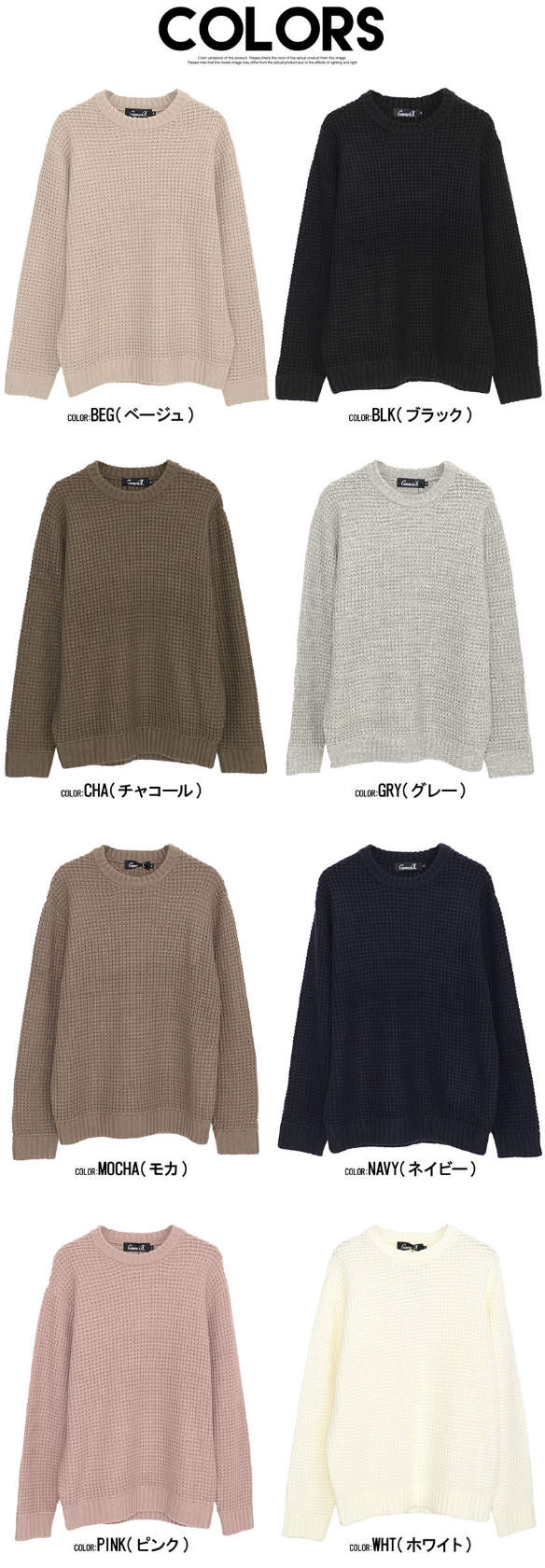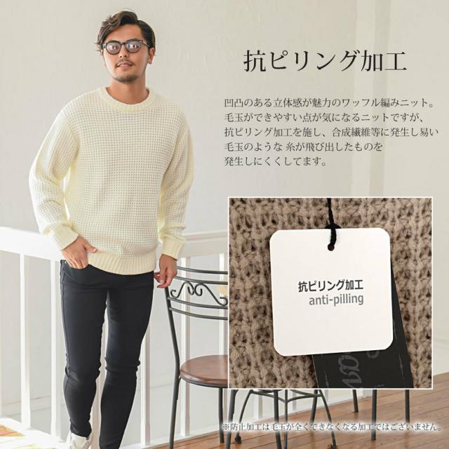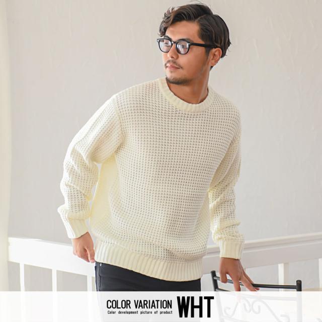 ニット セーター メンズ 長袖 トップス クルーネック ワッフル編み ヘヴィーウェイト 厚手 無地 大きいサイズ ビッグシルエット ベージュ ブラック グレー ホワイト 黒 白 M L XL CavariA キャバリア 秋 冬 即日発送 [CAJP21-06]