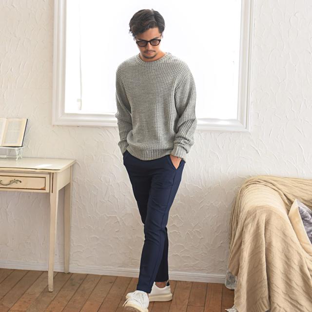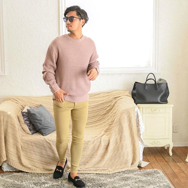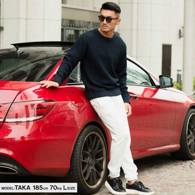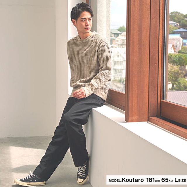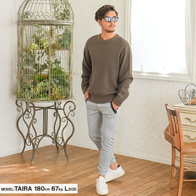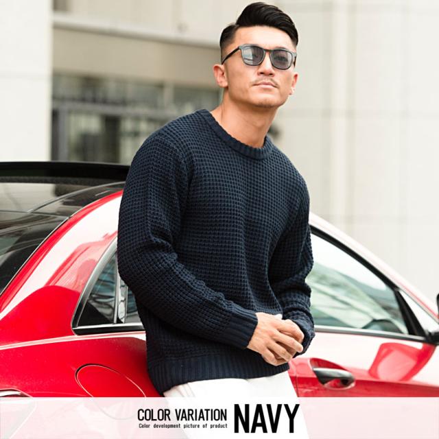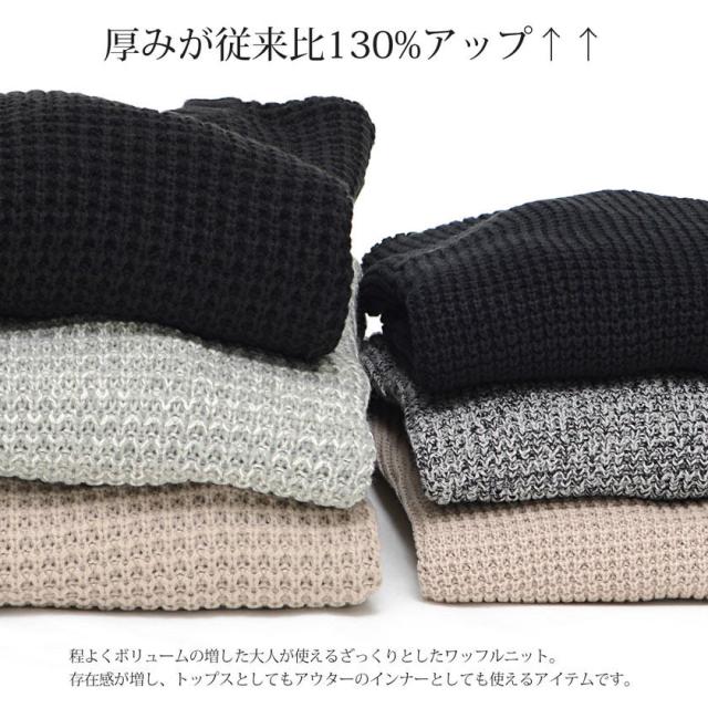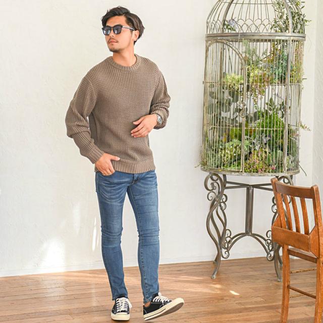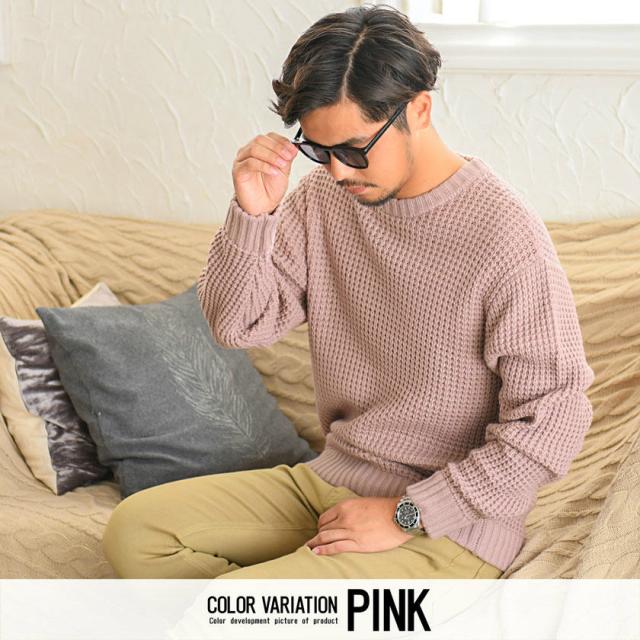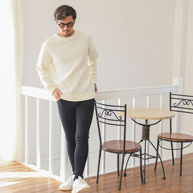 ニット セーター メンズ 長袖 トップス クルーネック ワッフル編み ヘヴィーウェイト 厚手 無地 大きいサイズ ビッグシルエット ベージュ ブラック グレー ホワイト 黒 白 M L XL CavariA キャバリア 秋 冬 即日発送 [CAJP21-06]