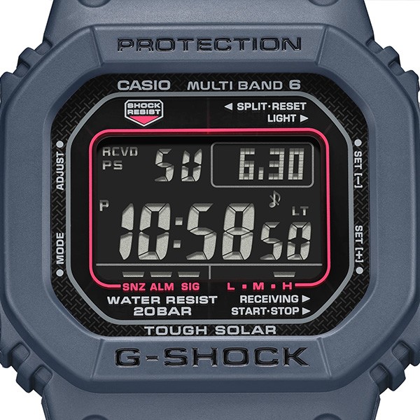 1983年に誕生したDW-5000Cのデザインを継承しているスクエアフェイス5600シリーズのマルチバンド6搭載モデルです。ファーストモデルDW-5000のケース形状、文字板デザインを受け継ぎ、クラシカルなデザインとしました。タフネスをコンセプトに進化を続けるG-SHOCKの中で、ファーストモデルのDNAを受け継ぎ、更に進化したモデルです。