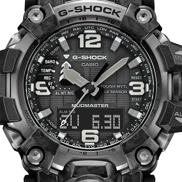 GWG-2000は土砂や泥濘の中での任務に求められる防塵・防泥構造はそのままに、新しく開発した外装技術でダウンサイジングを行い、装着感の向上を図っています。新開発のフォージドカーボンベゼルと、カーボンコアガード構造のケースを採用することで小型化を実現。ステンレス製のボタンパイプとシリコーン製の緩衝素材を組み合わせた新開発のマッドレジストボタンにより薄型化を実現しました。