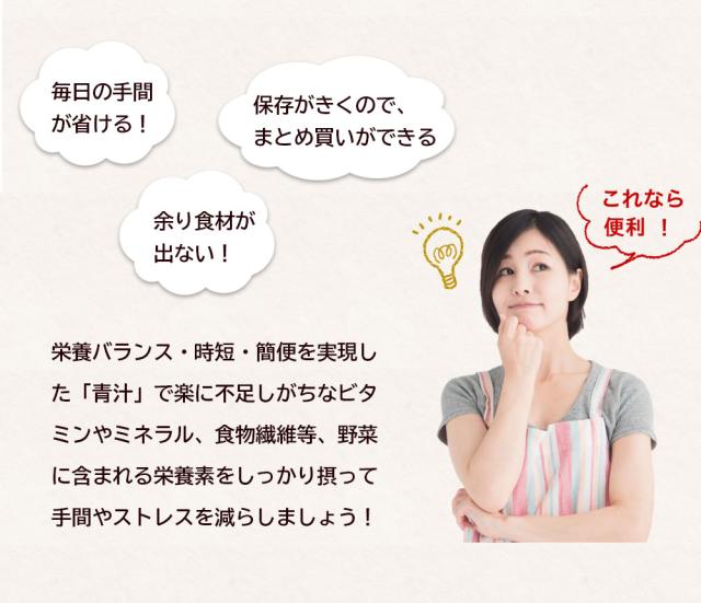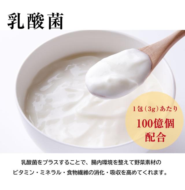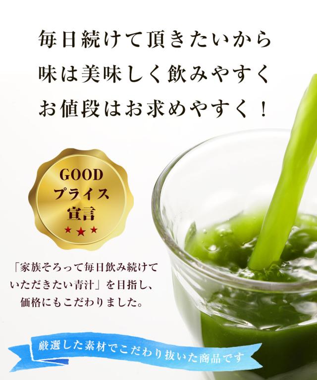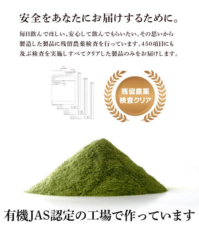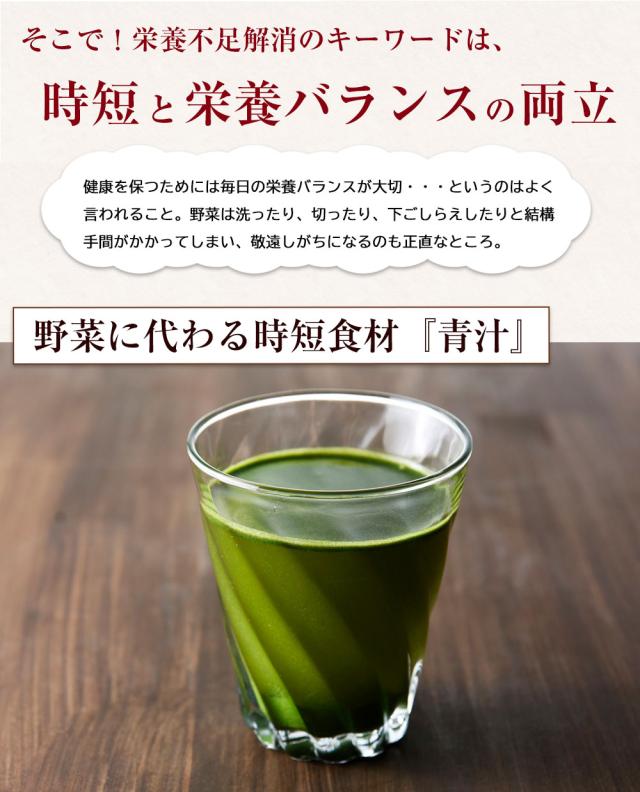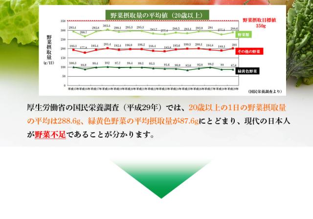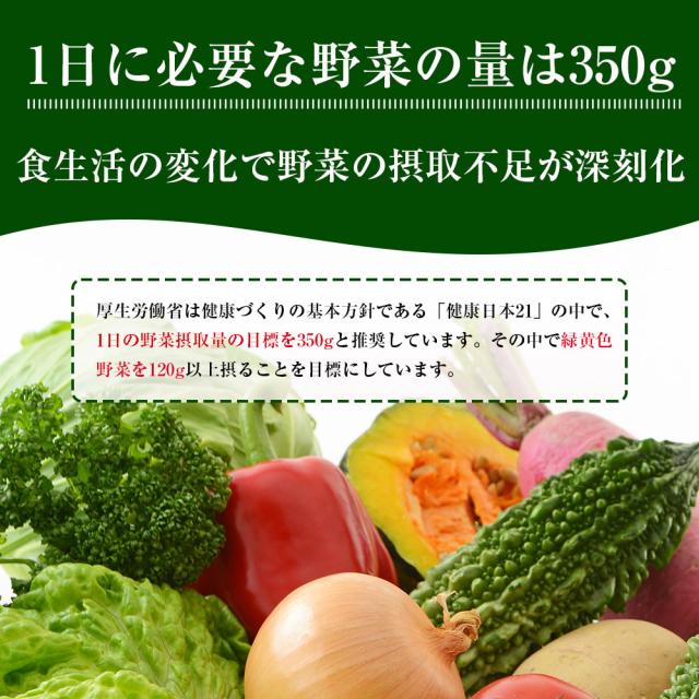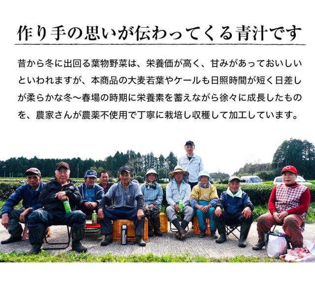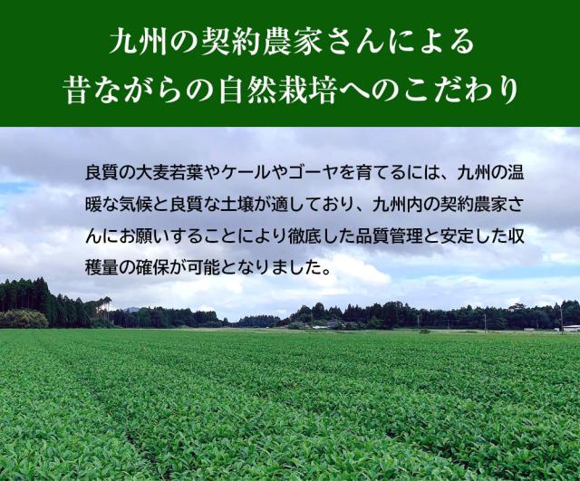 製法、商品設計へのこだわり くせが少なく飲みやすい大麦若葉を主原料にケール、ゴーヤの3種の九州産野菜を配合。 これら3種の野菜の栄養価に水溶性食物繊維(難消化性デキストリン)を配合することにより野菜の不溶性食物繊維と難消化性デキストリンの水溶性食物繊維をバランスよく摂取可能です。さらに乳酸菌も配合し、健康面の機能を強化しました。 原料の産地・栽培方法、製造環境・品質管理へのこだわり 使用している大麦若葉、ケールは、九州内の契約農家にて栽培期間中、農薬を一切使わない方法にて栽培。良質の大麦若葉やケールやゴーヤを育てるには、九州の温暖な気候と良質な土壌が適しており、九州内の契約農家を活用することにより徹底した品質管理および安定した収穫量の確保が可能となります。弊社では、常に原料に関し品質の向上、品質の均一化に関する技術的な向上に向けて契約農家とともに取り組み、厳選した原料のみを使用しております。