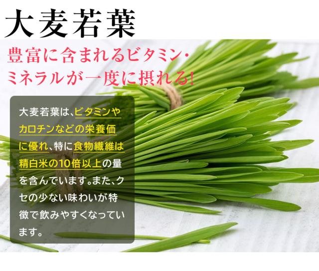 | 原材料名 | 麦若葉末(大麦若葉(九州産))、マルトデキストリン、難消化性デキストリン(小麦を含む)、還元麦芽糖水飴、ケール末(九州産)、ゴーヤ末(九州産)、殺菌乳酸菌末(殺菌乳酸菌、デキストリン末) |