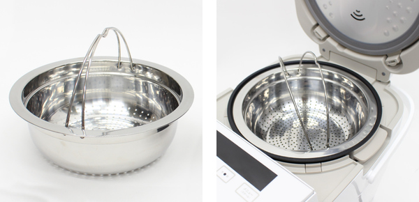 外釜と内釜をセットし、糖質OFFご飯が炊けます。内釜は、釜底に無数の穴が空いているので糖質成分を含んだ煮汁は全て流れ出します。外釜は、内釜から流れ出た煮汁をキャッチする受け皿のような役割を果たします。また、流れ出た煮汁は自動で排出されます。