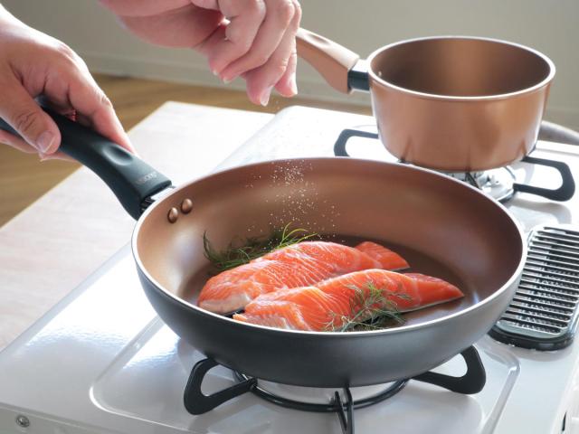 内面に施されたふっ素樹脂加工により食材がこびりつきにくく、汚れも落としやすいのでお手入れが簡単です。