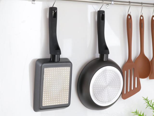 ハンドル部分の穴にフックを引っ掛けて吊り下げることができます。サイズ違いで揃えても場所を取らずに収納できます。