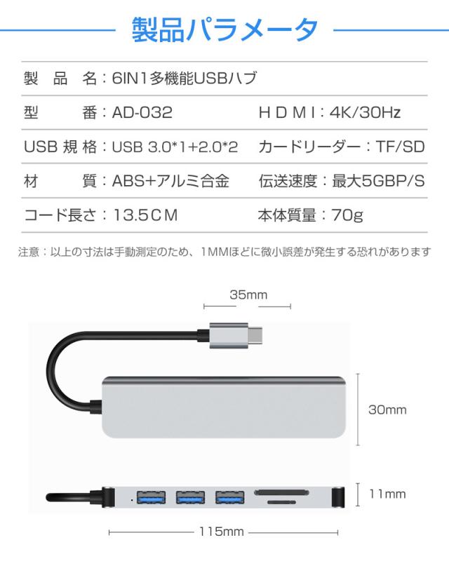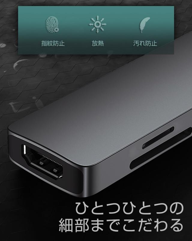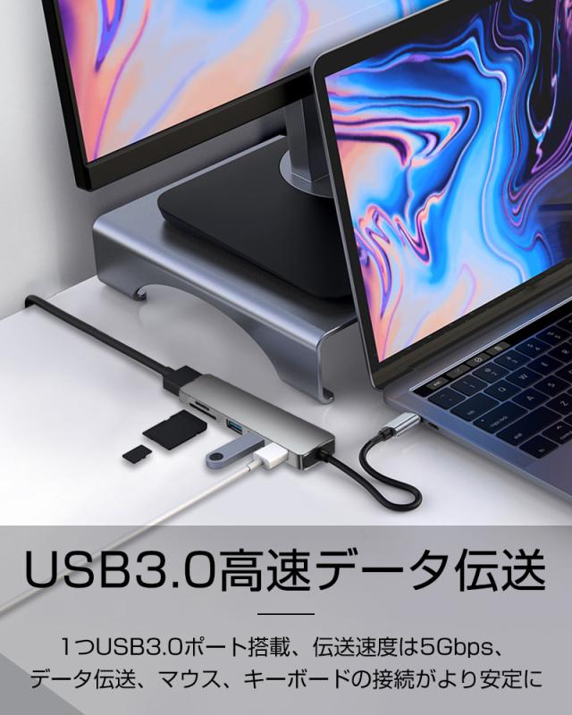 【一体成型&6in1】一体成型の超軽量設計で、接続用のType Cを別途用意する必要はなく、持ち運びが便利です。USB Cに対応できる機種であれば使用できます。3つのUSB3.0ポートにSD・TFカードリーダーやHDMI出力ポートを搭載しており、汎用性に優れます。