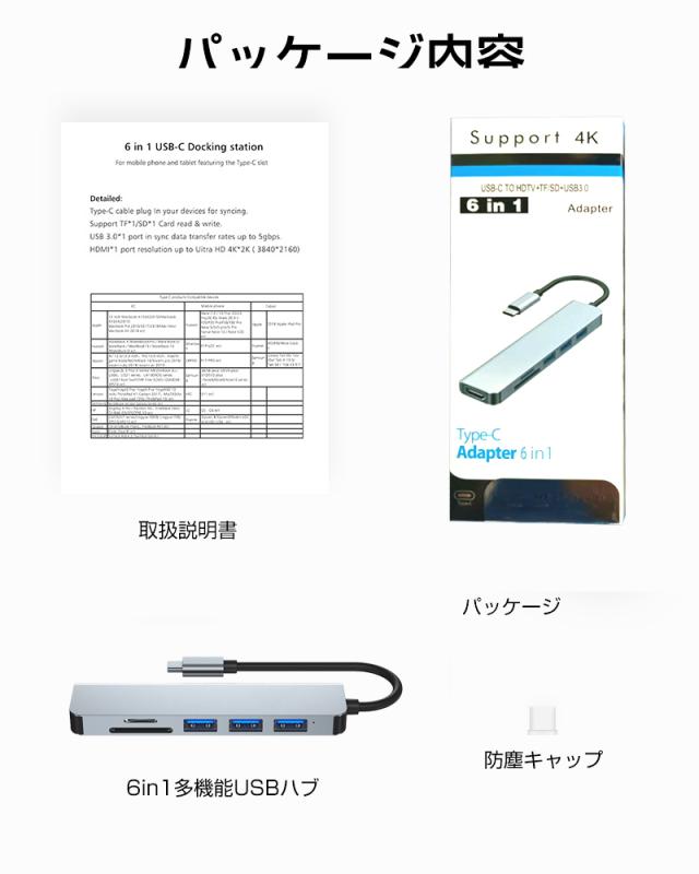 【パッケージ内容】USB C ハブ本体、コネクタ防塵キャップ、取扱説明書