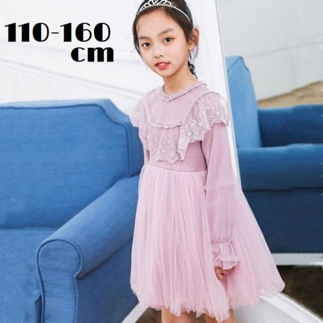 ワンピース フォーマルドレス 子供服 キッズ ジュニア 女の子 長袖 ギャザー 胸元フリル チュールレース メッシュ 膝丈 プリンセス かわいい おし