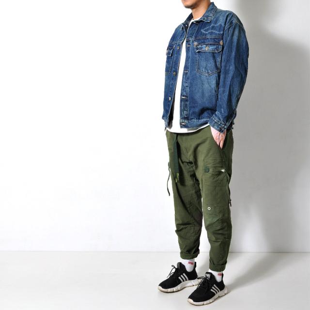 ダメージ加工の施されたデニムジャケット胸ポケットに施された、刺繍のラインもアクセントの、
