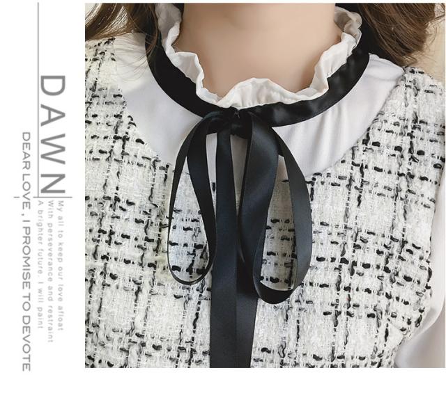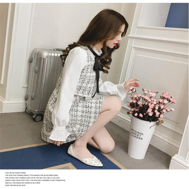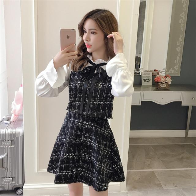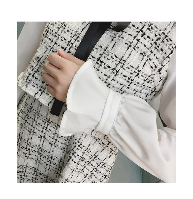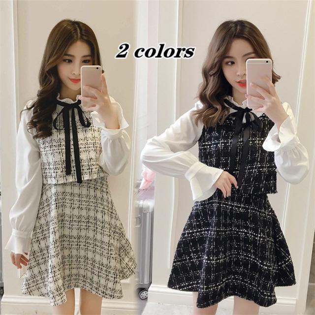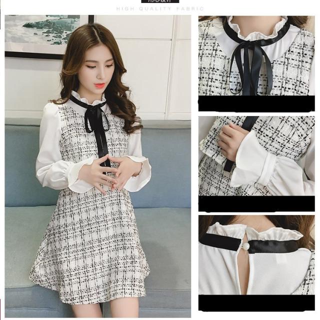 韓国 ファッション レディース ワンピース ツイード ミニ丈 ボウタイ リボン フリル エレガント ガーリー 長袖 女子会 食事会 春秋 冬新作