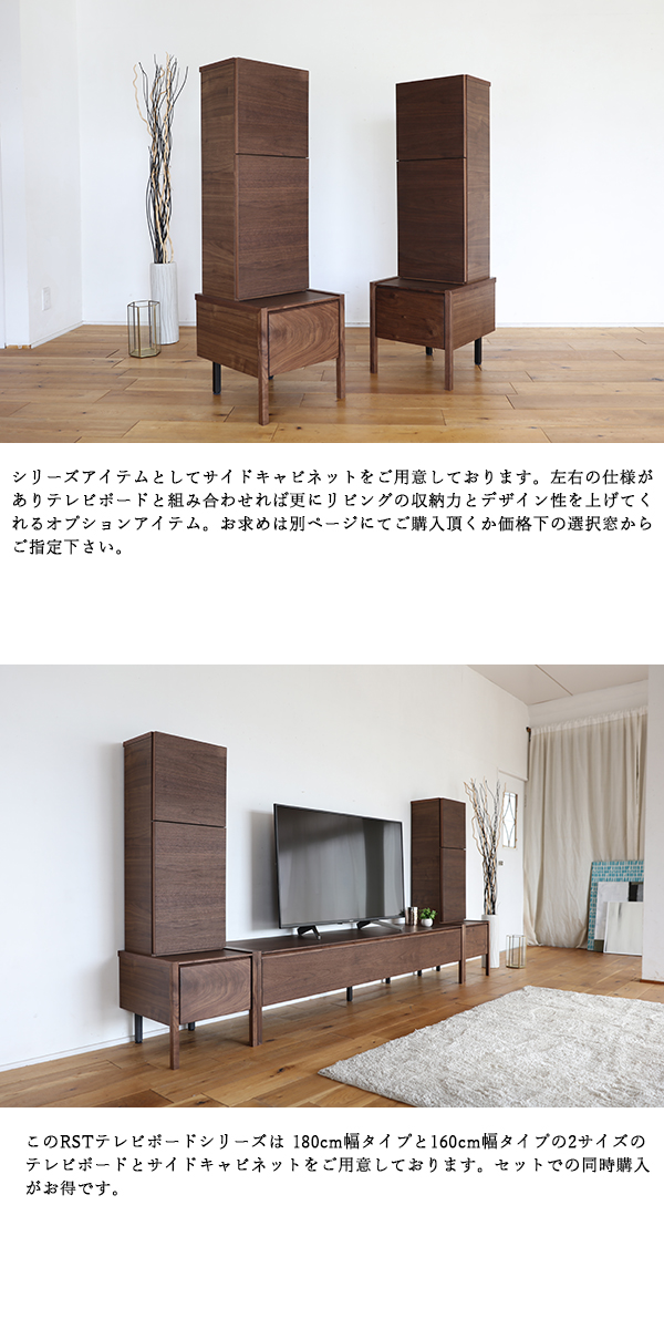 このRSTテレビボードシリーズは 180cm幅タイプと160cm幅タイプの2サイズのテレビボードとサイドキャビネットをご用意しております。セットでの同時購入がお得です。