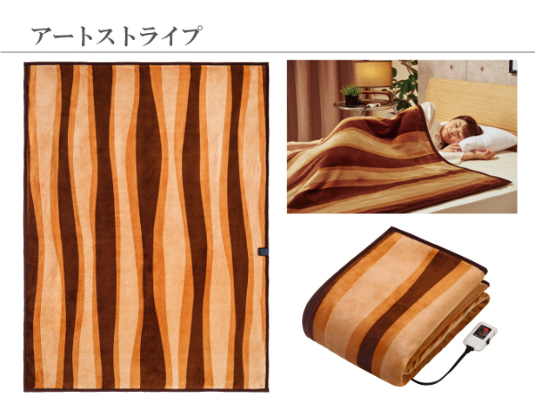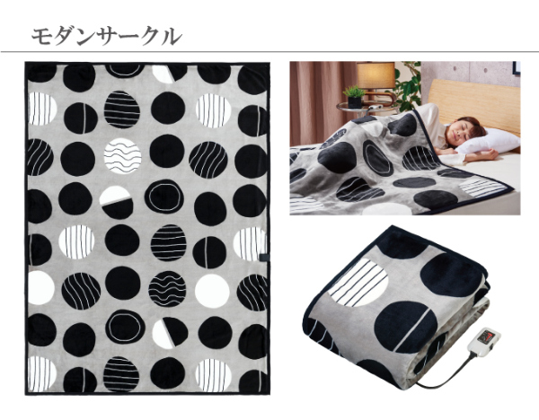 触り心地のよい、滑らかな生地とおしゃれなデザインの電気毛布。本体は洗濯機で洗濯可能(要ネット使用)な仕様です。使いやすいコントローラーにはタイマー設定やダニ退治機能つき。安心の日本製です。【カラー】モダンサークル、アートストライプ、クリエイティブスクエア【商品サイズ(約)】190×140cm【保証期間】1年間【生産国】日本