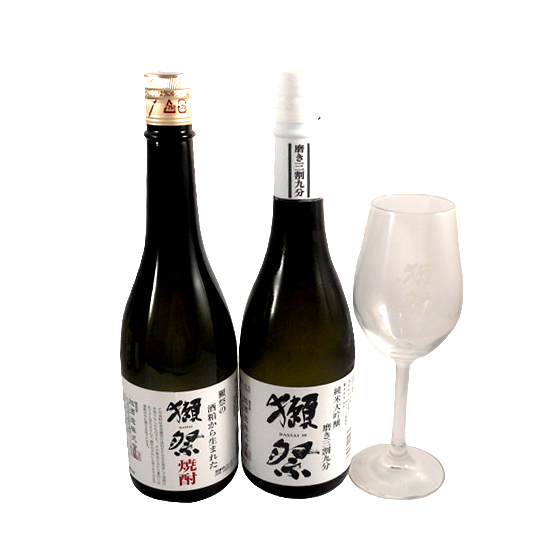 山口の蔵元、旭酒造さんの獺祭 焼酎と日本酒 純米大吟醸39、グラスがセットになりました。