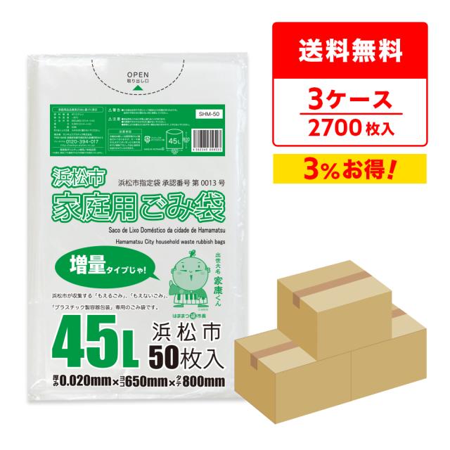 【まとめて3ケース】SHM-50-3 浜松市指定家庭用 ごみ袋 45リットル 0.020mm厚 半透明 50枚x18冊x3箱/ ゴミ袋 ごみ袋 送料無料