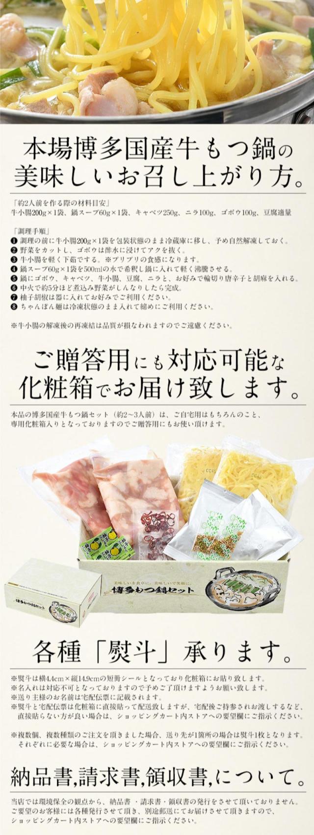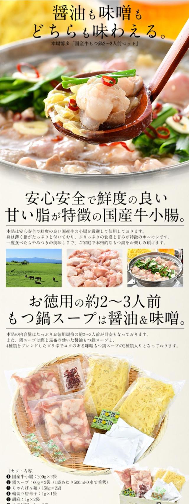 牛小腸(国産)、鍋スープ・醤油(醤油(国内製造)、かつおだし、発酵調味料、みりん、昆布エキス、還元水飴、食塩、カツオエキス、砂糖/調味料(アミノ酸等)、酒精、(一部に小麦・大豆を含む))、鍋スープ・味噌(味噌(国内製造)、みりん、還元水飴、食塩、発酵調味料、鰹節エキス、砂糖、調製ラード、醤油、香辛料/調味料(アミノ酸等)、酒精、カラメル色素、甘味料(甘草)、(一部に小麦・大豆・豚肉を含む))、ちゃんぽん麺(小麦粉(国内製造)、澱粉、粉末卵白、植物性蛋白、食塩/かんすい、焼成カルシウム、クチナシ色素(一部に小麦・卵を含む))、輪切り唐辛子(中国産)、胡麻(白ごま)、柚子胡椒(ゆず皮(国産)、青唐辛子、食塩)