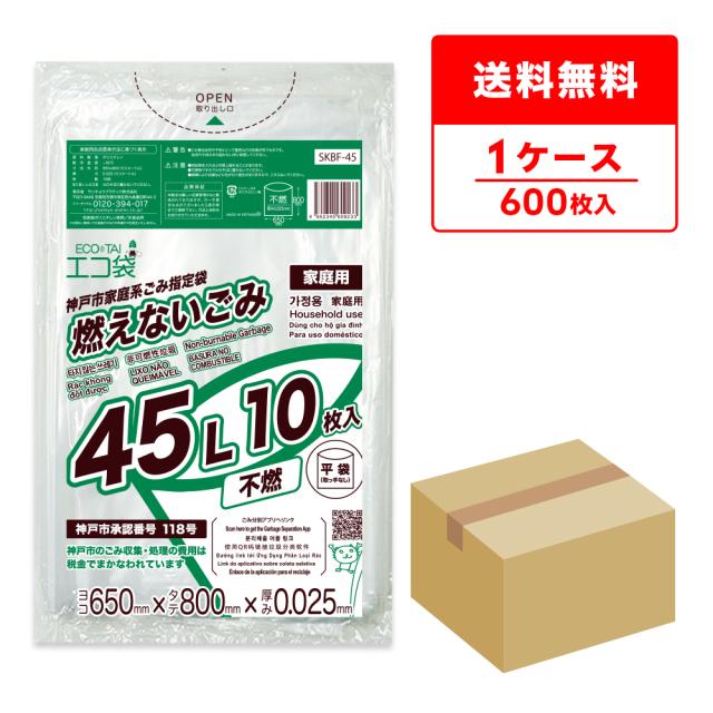 神戸市指定ごみ袋 家庭用燃えないごみ袋 不燃 45リットル 0.025mm厚 透明 10枚x60冊 SKBF-45 / まとめ買い お得 ポリ袋 ビニール袋 神戸市指定袋 もえないゴミ 45L サンキョウプラテック 送料無料