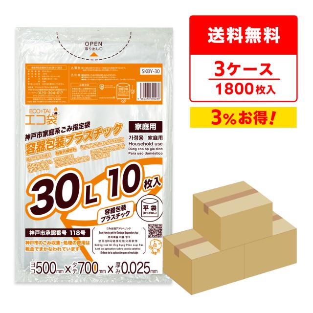 【まとめて3ケース】SKBY-30-3 神戸市指定袋家庭用 容器包装プラスチック用 30リットル 0.025mm厚 透明 10枚x60冊x3箱/ ゴミ袋 ごみ袋 送料無料