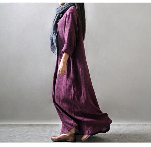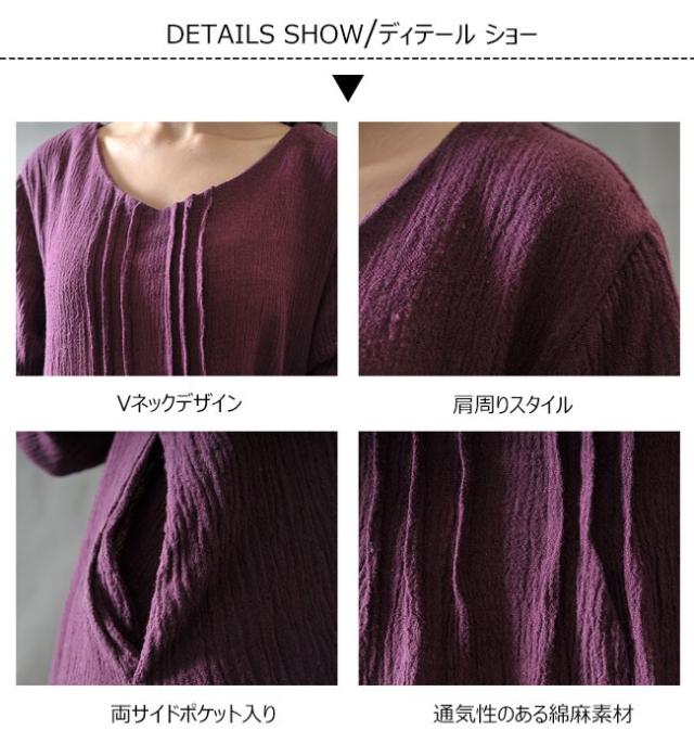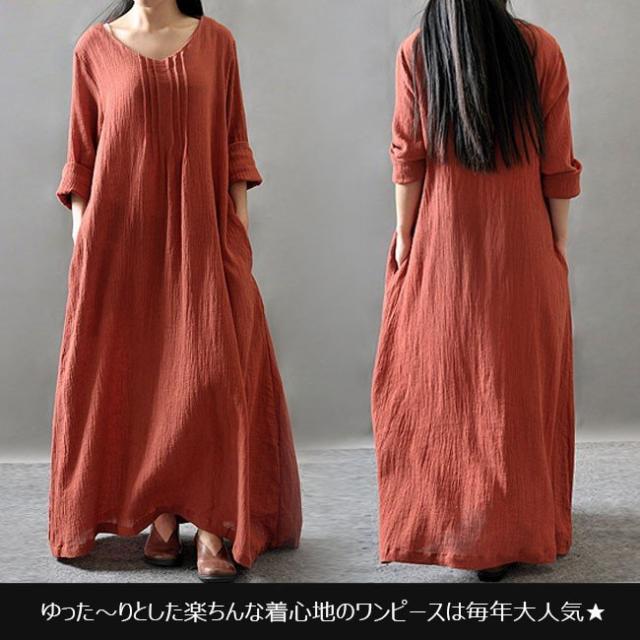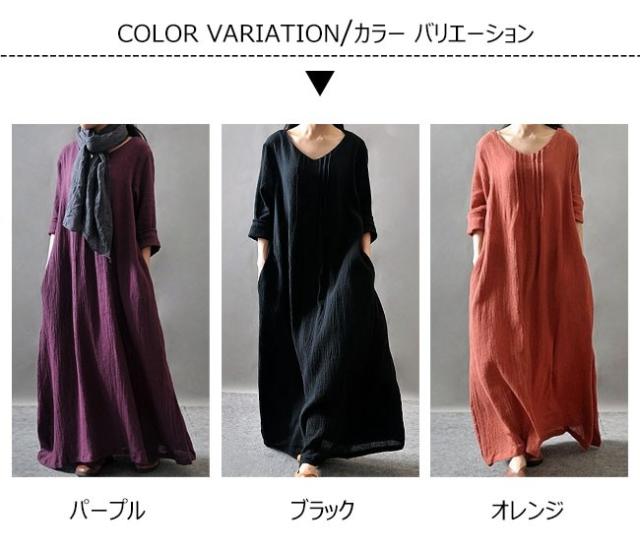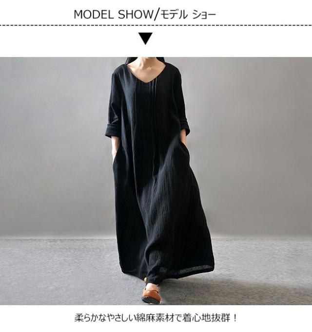 ワンピース レディース 綿麻ワンピース マキシ丈 Aライン 民族風 エスニック ゆったり ふんわり シンプル 無地 長袖 Vネック 2020春新作