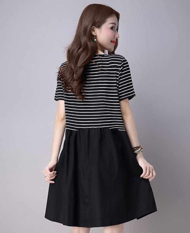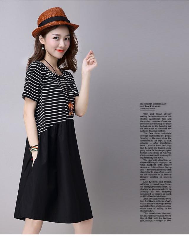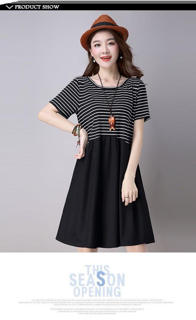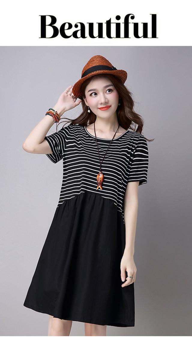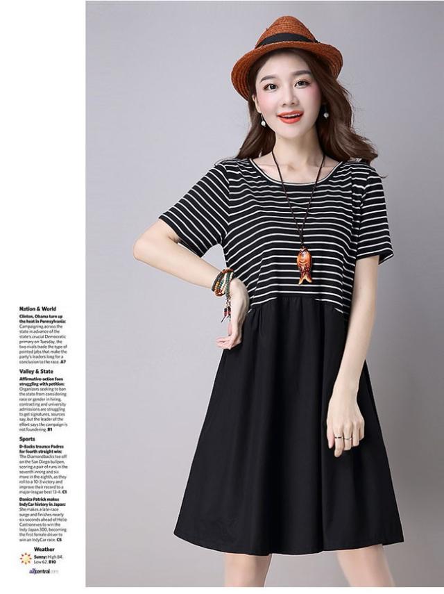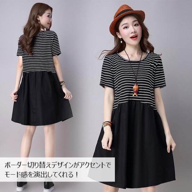 レディース ワンピース ボーダー切り替え ミディアム丈 半袖ワンピ ボーダー柄 ゆったり フレア裾 トップス 2020春新作