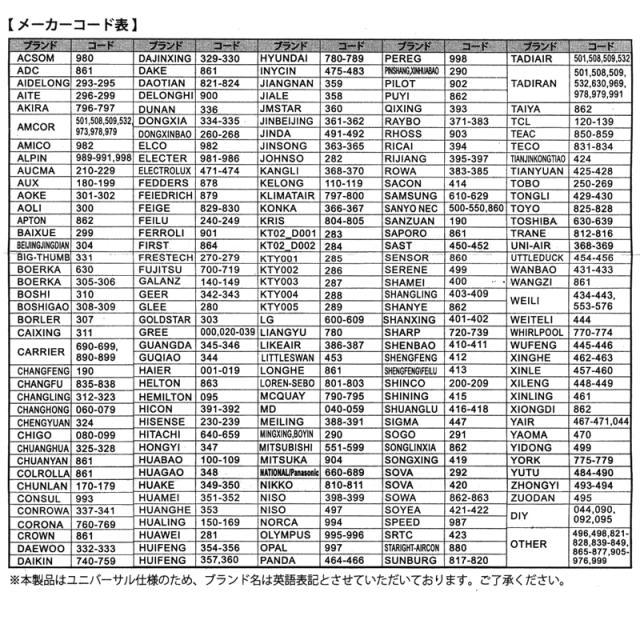 ※エアコンの電源が入らない場合、メーカーコードーの他の数字を試してください