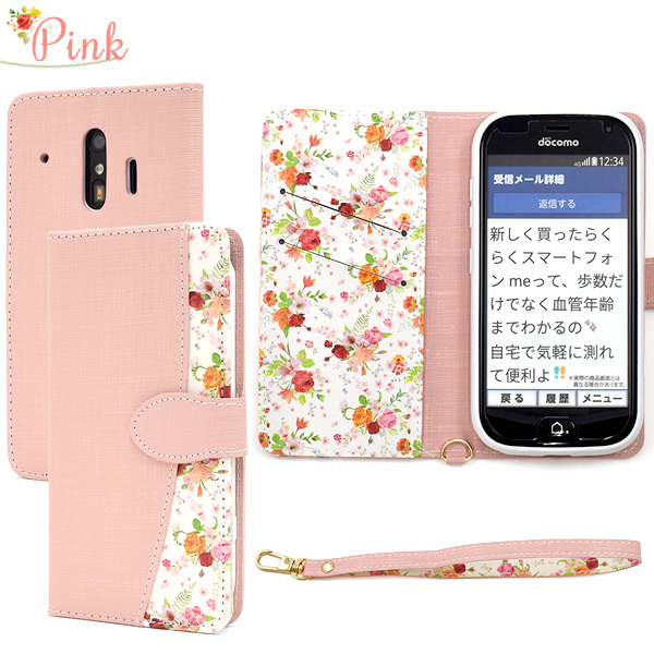 スマホケース らくらくスマートフォン me F-01L F-42A用 手帳型 手帳型 花柄 ハッピーブーケ 花模様 お花 かわいい 装着簡単 携帯カバー 華やか 携帯ケース フェミニン 上品 可愛い 小花 エレガント フラワー お洒落 スマホカバー おしゃれ
