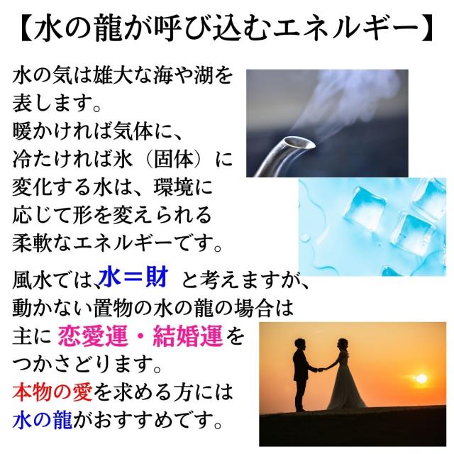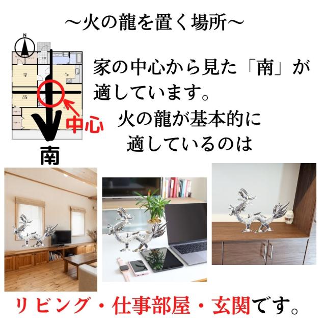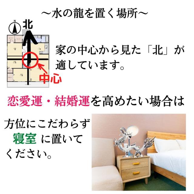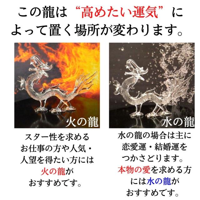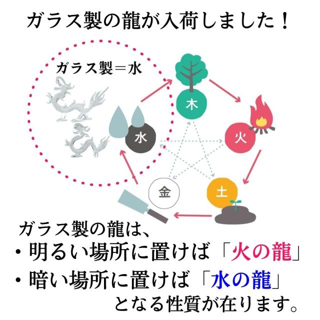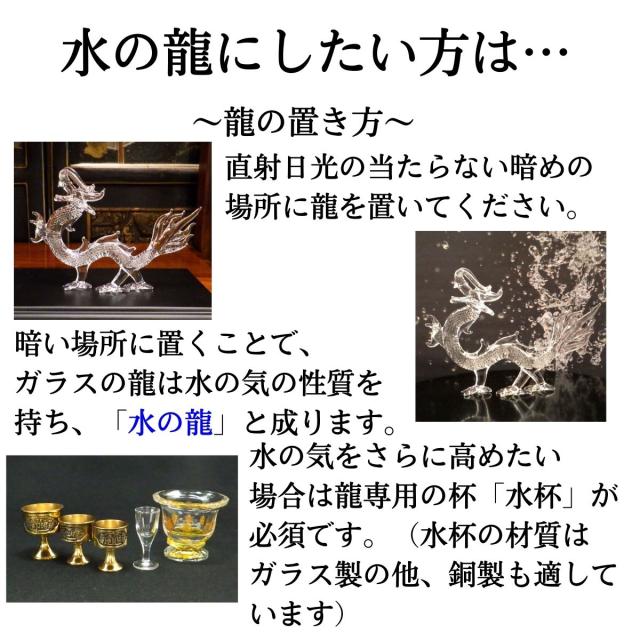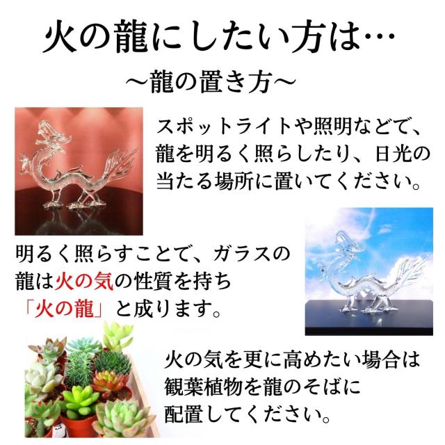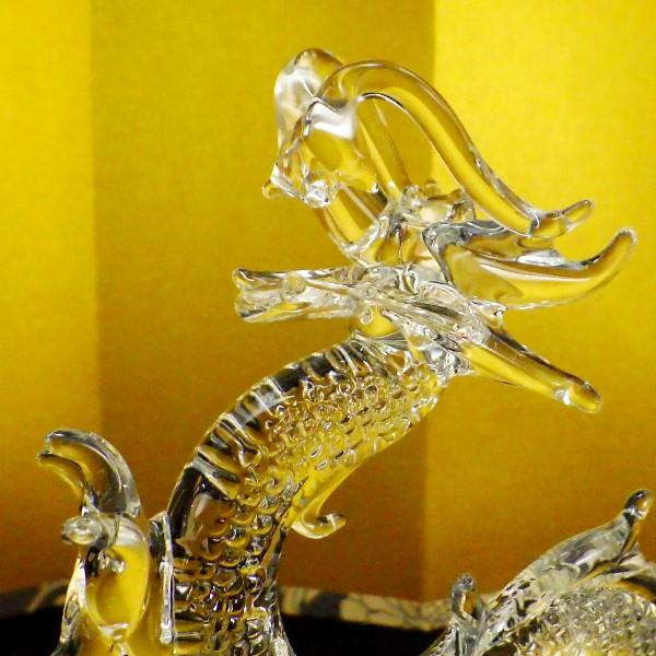 ガラス製の龍は、明るいところに置けば“火”の要素で開運祈願が、暗いところに置けば“水”の要素で財運が期待できます。
