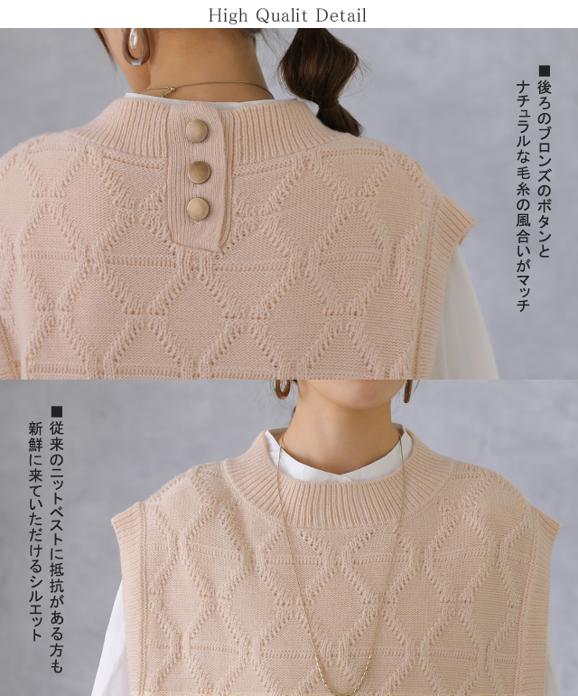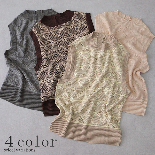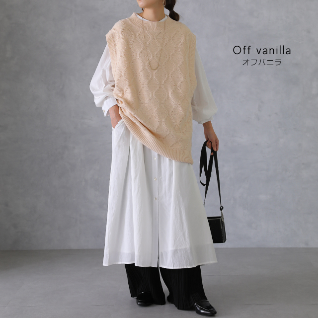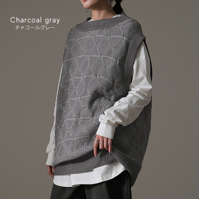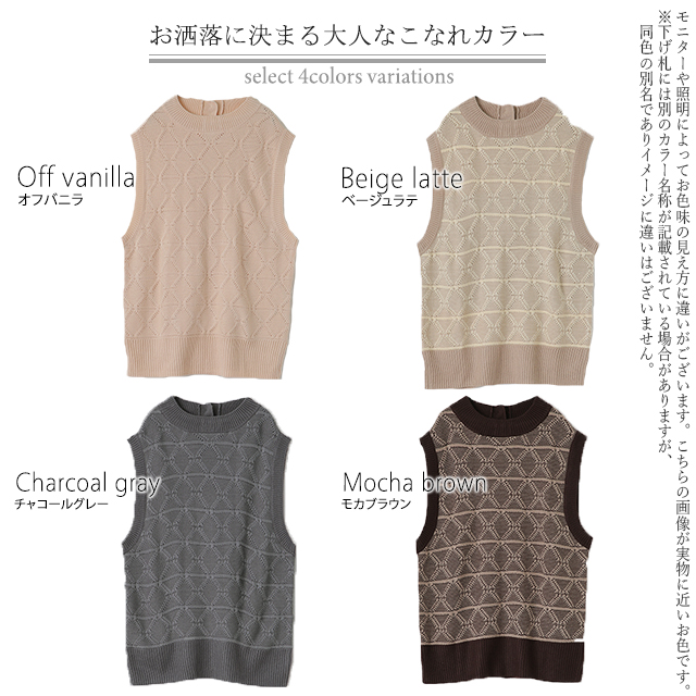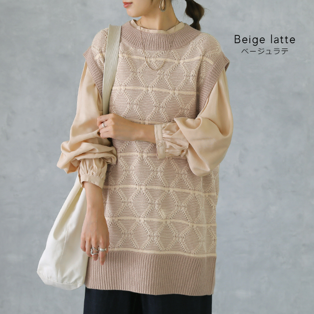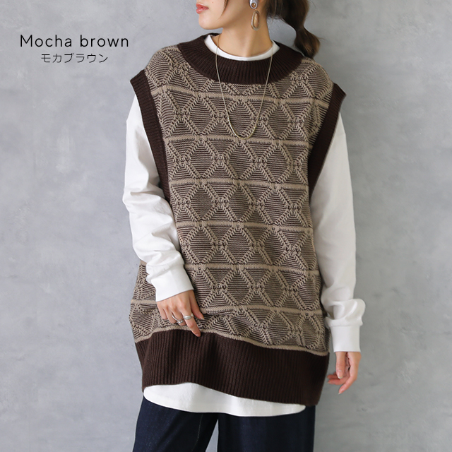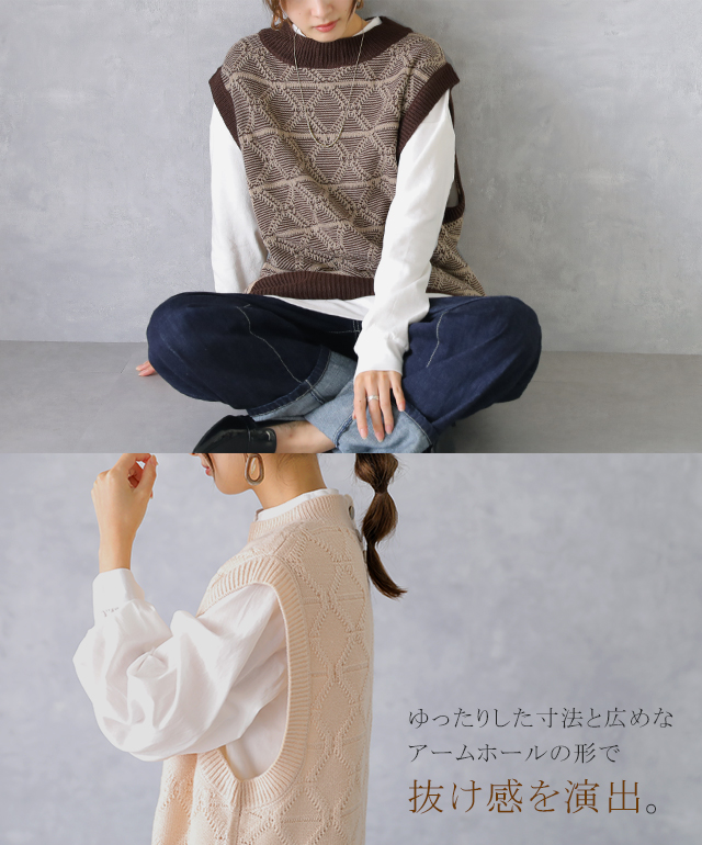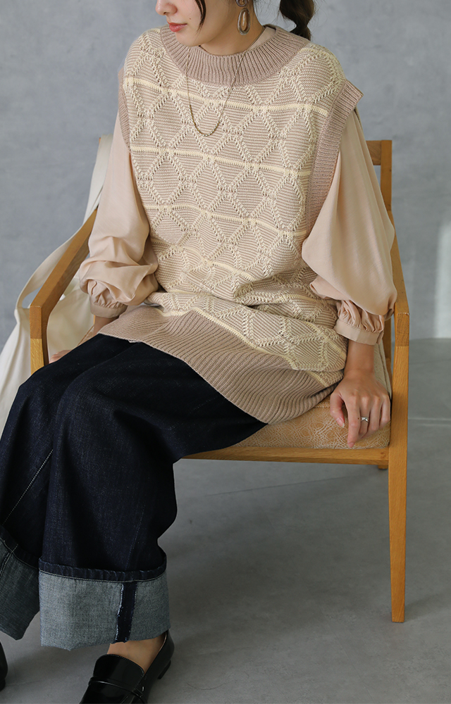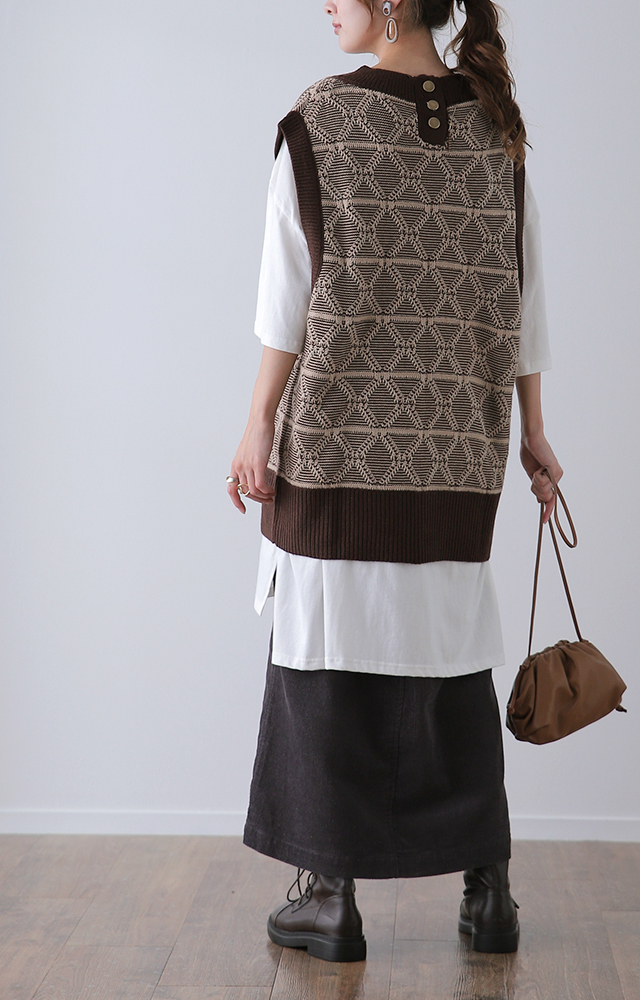 総柄のジャガードニットがコーデの主役になるニットベスト。