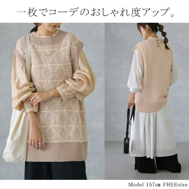 重ねる ニット ベスト 模様編み ジャガード ニットベスト ジャガードニット レディース レイヤード トップス セーター 半袖 チュニック ロング 柄 重ね着 Uネック 大きいサイズ ケーブル 冬 秋 ブラック 秋新作