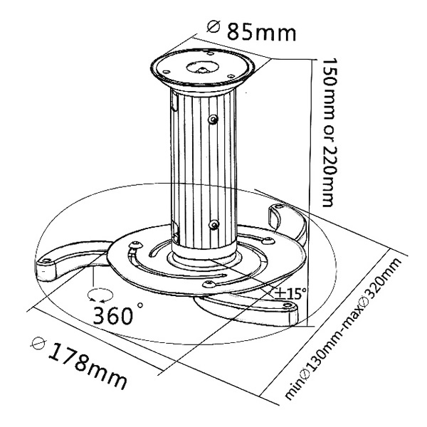 ※取付けは取付工事専門業者にご依頼ください。 ■対応:プロジェクター天吊り金具(VESA規格対応) ■カラー:メタル ■耐重量:10kg ■質量:1.0kg ■取付可能ピッチ:130〜320mm ■回転:360度回転 ■上下角度調節:±15° ■外形寸法:178(幅)×150or220(高)×178(奥)mm ■付属品: ・取付ネジ ・取付説明書 プロジェクターへの取り付けは、M5以下のネジをご利用ください。 ※記載は商品仕様の一部です。仕様説明不足等の理由での返品はできません。特に適合等は必ずご確認ください。