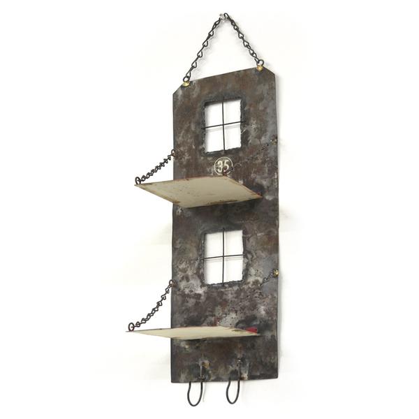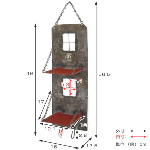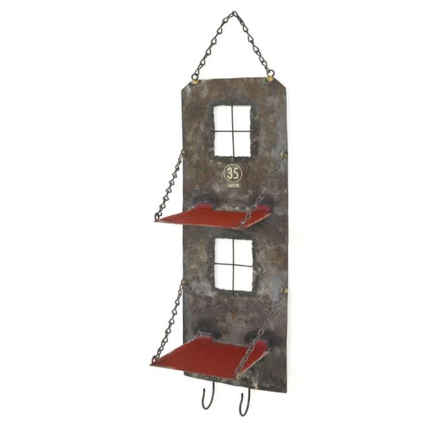 プレートにプレートを組み合わせた個性派ウォールシェルフです。棚板の濃い赤色がよりジャンクっぽさを際立たせています。要所に使われているチェーンも、無骨な雰囲気を引き立たせるいいアクセントになっています。