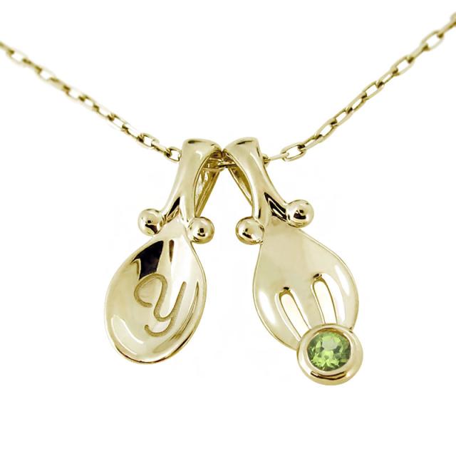 8月誕生石ペリドットを使用した、18金製のベビースプーン&フォーク・ネックレスです。