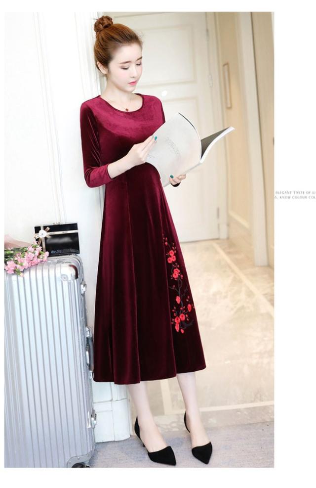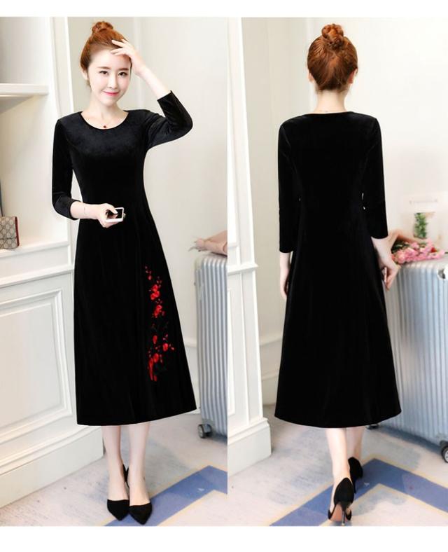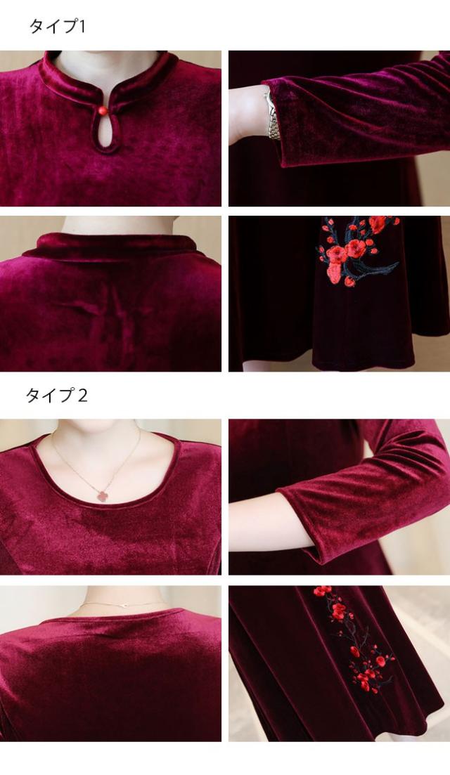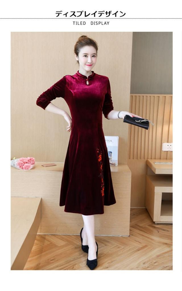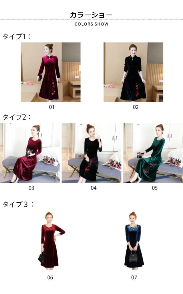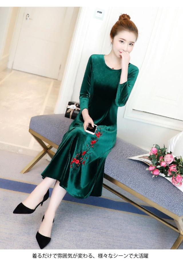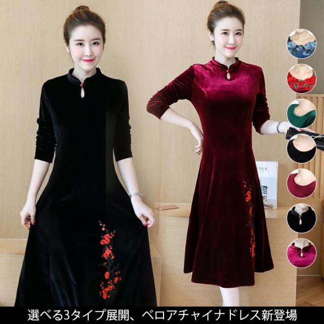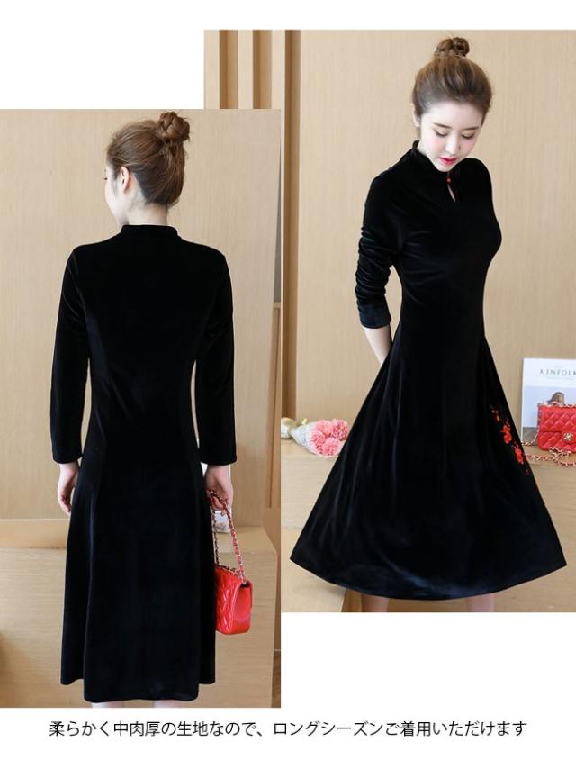 ワンピース レディース チャイナドレス チャイナ服 中華風 ベロア 花柄 ロング丈 長袖 オールインワン 秋 冬 春 2020秋冬新作