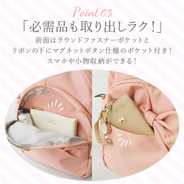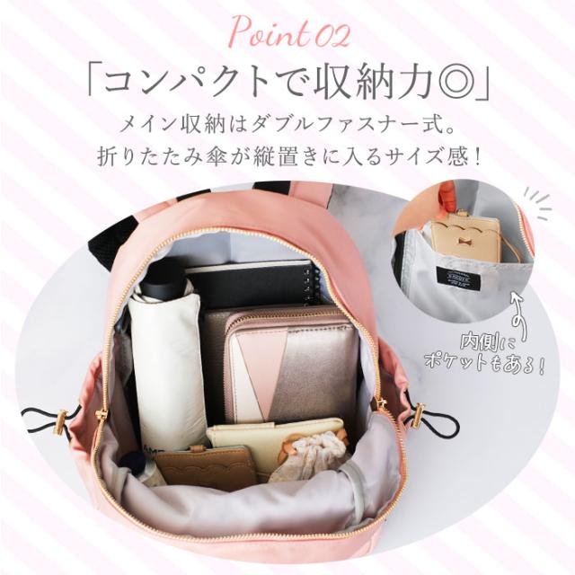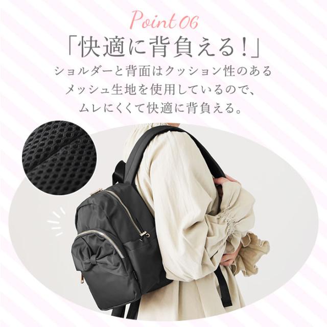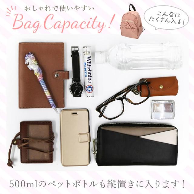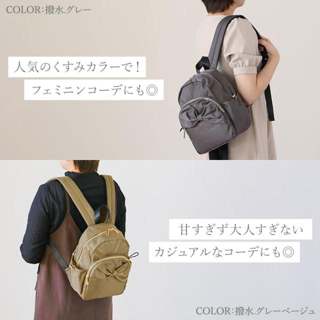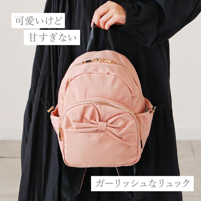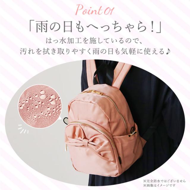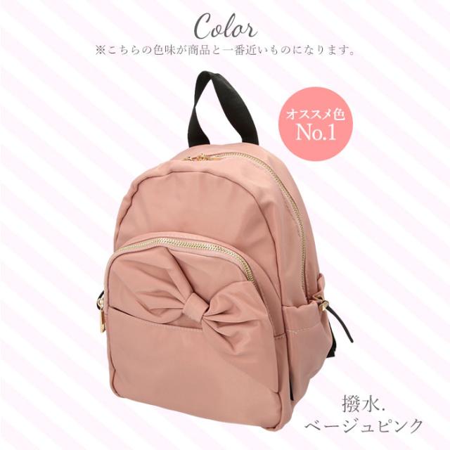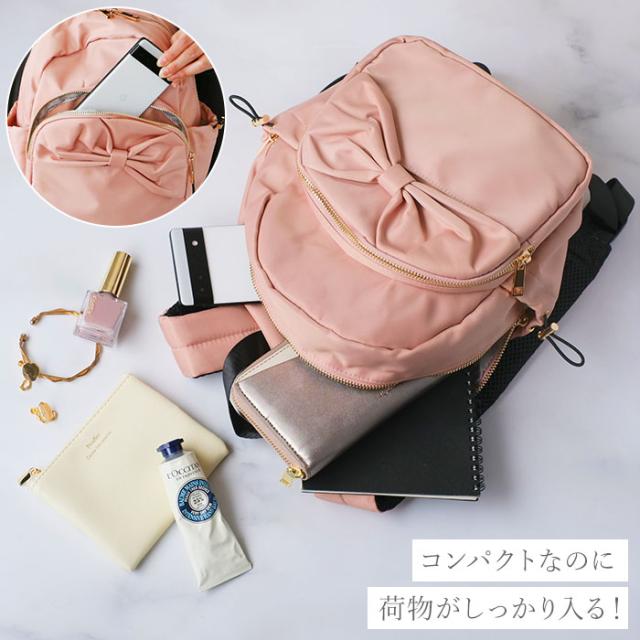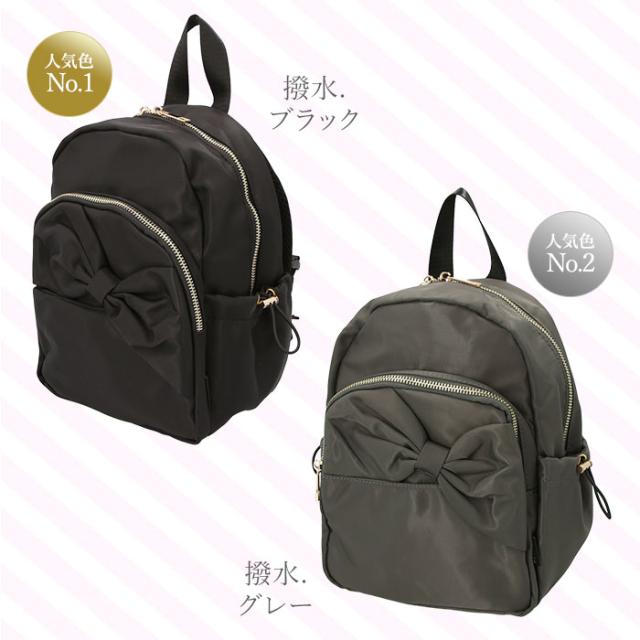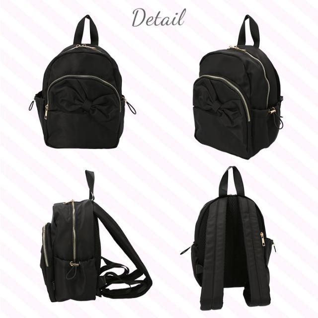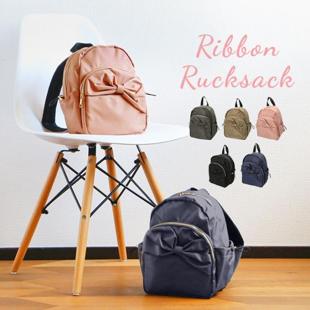 リュック 小さめ レディース 軽量 通販 ミニ リボン リボン柄 リュックサック ナップザック バックパック デイパック ザック 撥水 ナイロン 背面ポケット付 ストレッチコード ボトルフォルダ かわいい デザイン