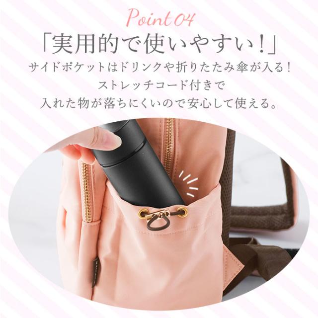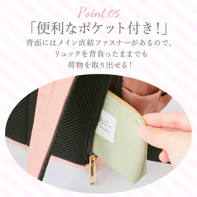 | 商品説明 | ・コーディネートのポイントになるリボンが目を引くガーリッシュなリュックが新登場。 ・撥水加工を施しているので、汚れを拭き取りやすく雨の日も気軽に使える♪(※完全防水ではございません) ・メイン収納は左右どちらからでも開けられるダブルファスナー仕様。500mlのペットボトルが縦置きできるサイズ感でオープンポケット×1を装備。 ・前面はラウンドファスナーポケット×1とリボンの下にマグネットボタン仕様のポケットがあるので小物を整理整頓できる。 ・両サイドのポケットは水筒や折り畳み傘を差し込めてさらにストレッチコード付き!入れた物が落ちにくいので安心して使える。 ・背面にはメイン直結ファスナーがあるので、リュックを背負ったままでも荷物を取り出すことが可能。 ・ショルダーと背面はクッション性のあるメッシュ生地を使用しているので、ムレにくくて快適に背負える。 ・お出かけがより一層楽しくなるアイテム♪ |