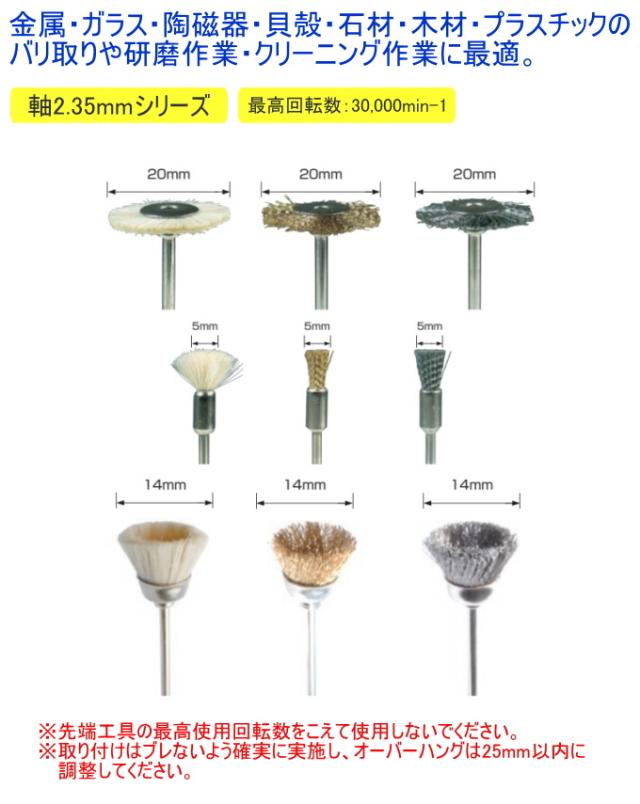 金属・ガラス・陶磁器・貝殻・石材・木材・プラスチックの切断後のバリ取りや研磨作業・クリーニング作業に最適です。 用途に合わせて毛・真鍮・ステンレスをお使いください。 |