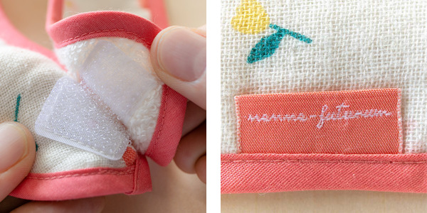 | 取り外しや調節が簡単 面テープ仕様なので着脱が簡単です。動き回る赤ちゃんにサッとワンタッチで付けることが出来ます。 | おしゃれなタグ付き 「nenne-futurm」のおしゃれなタグが付いています。出産祝いや誕生日のプレゼントにぴったりです。 |