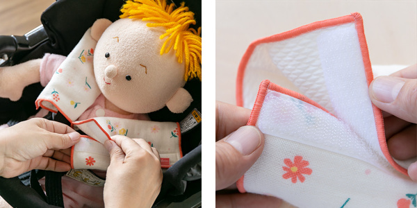 抱っこ紐だけでなく、ベビーカーやチャイルドシートにも取り付けることができます。ベルトは赤ちゃんの顔近くにありますが、汚れてもなかなか洗うことができない物が多いので、マルチに取り付けることができるのは嬉しいポイントです。