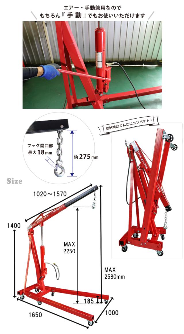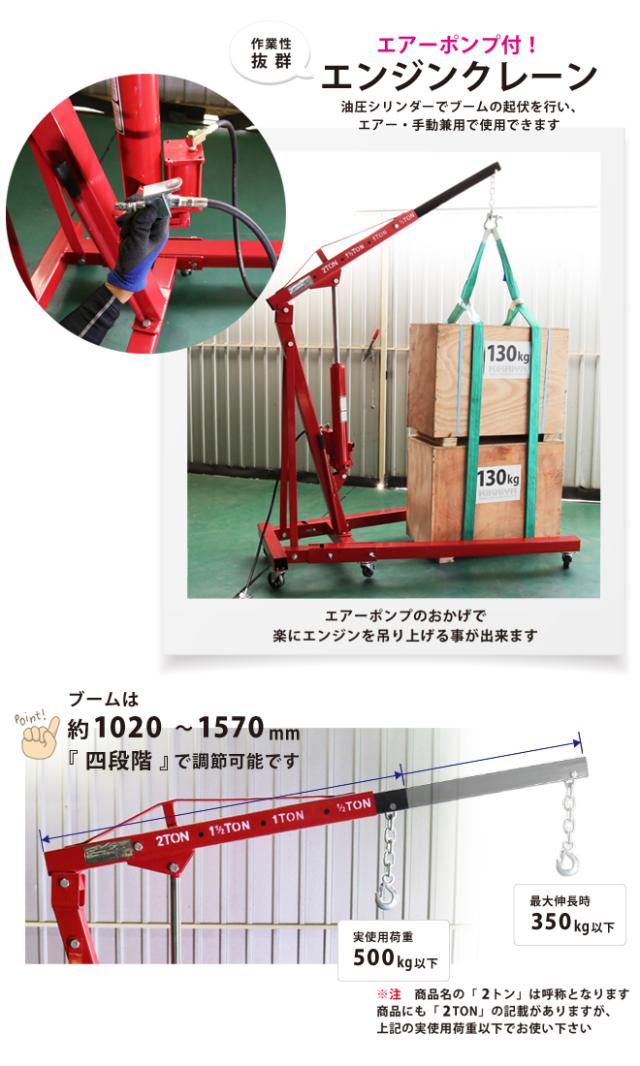 エンジンクレーン2トン エアーポンプ付 エアー手動兼用 マルチクレーン コンパクトクレーン 簡易クレーン 6ヶ月保証 KIKAIYA