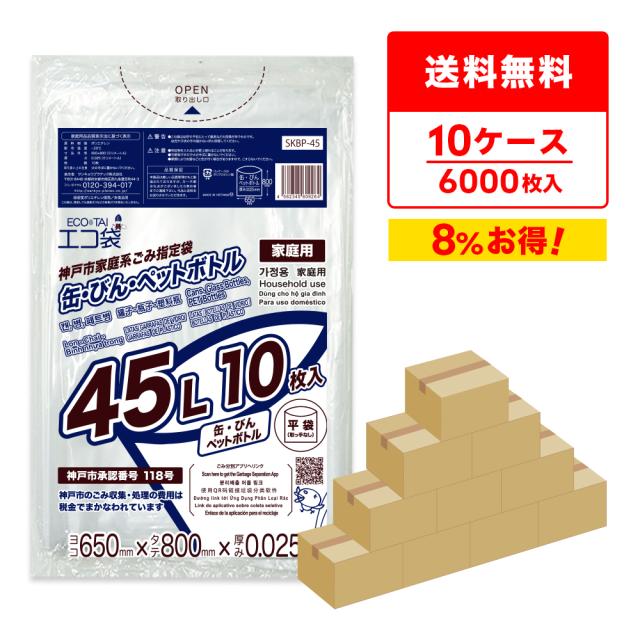 【まとめて10ケース】SKBP-45-10 神戸市指定袋家庭用 缶・ビン・ペットボトル用 45リットル 0.025mm厚 透明 10枚x60冊x10箱/ ゴミ袋 ごみ袋 送料無料