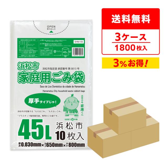 【まとめて3ケース】SHM-55-3 浜松市指定家庭用 ごみ袋 45リットル 0.030mm厚 半透明 10枚x60冊x3箱/ ゴミ袋 ごみ袋 送料無料