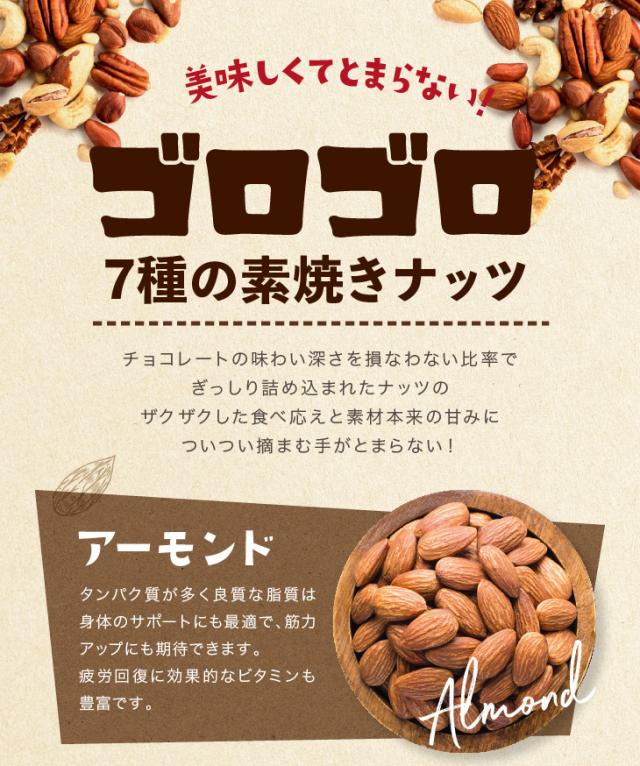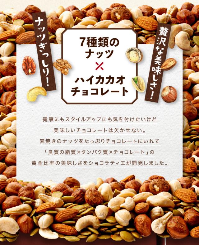 カカオマス(外国製造又は国内製造)、砂糖、アーモンド、カシューナッツ、くるみ、ココアバター、ピーカンナッツ、ピスタチオ、ヘーゼルナッツ、マカダミアナッツ/乳化剤、香料、(一部に乳成分・アーモンド・カシューナッツ・くるみ・大豆を含む)