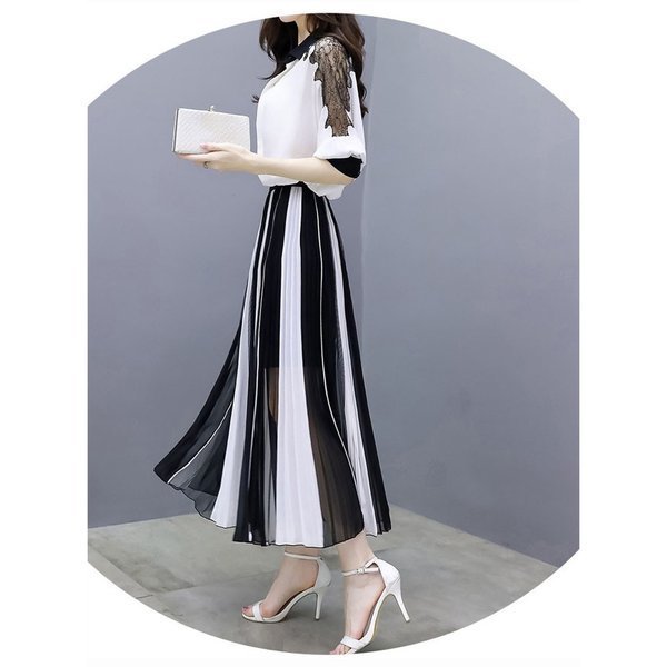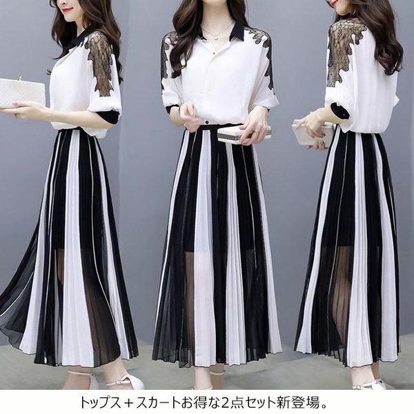 2点セット レディース 上下セット Tシャツ マキシ丈スカート 5分袖 レース 透け感 プリーツ セットアップ トップス ボトム