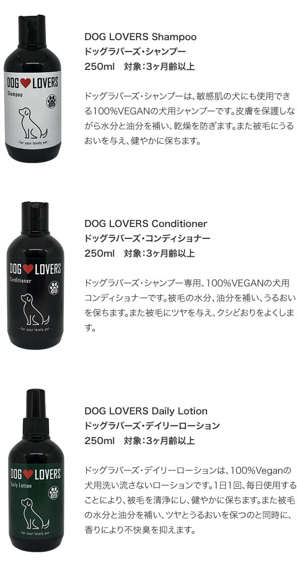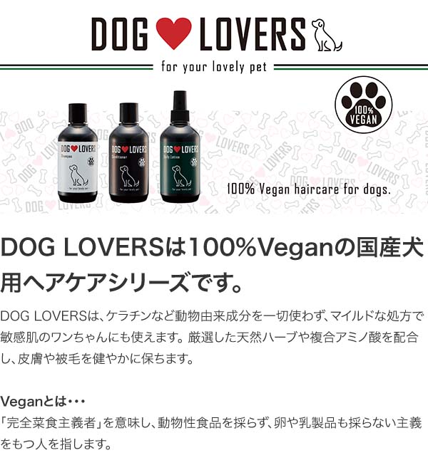 ドッグラバーズ・シャンプーは、敏感肌の犬にも使用できる100%VEGANの犬用シャンプーです。皮膚を保護しながら水分と油分を補い、乾燥を防ぎます。また被毛にうるおいを与え、健やかに保ちます。