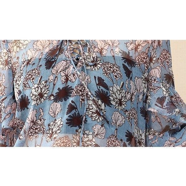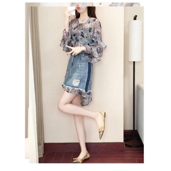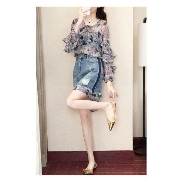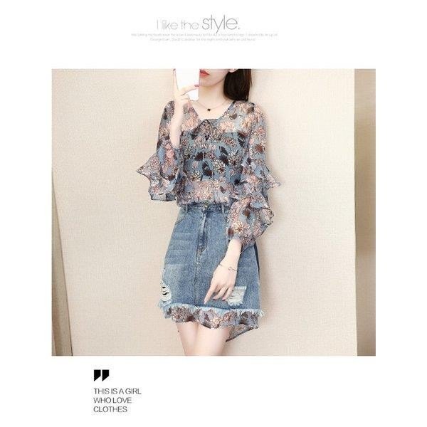 スーツセットアップ レディース 春秋 シフォン シャツ 花柄 七分袖 2点セットアップ 大きいサイズ ショート丈 デニムスカー