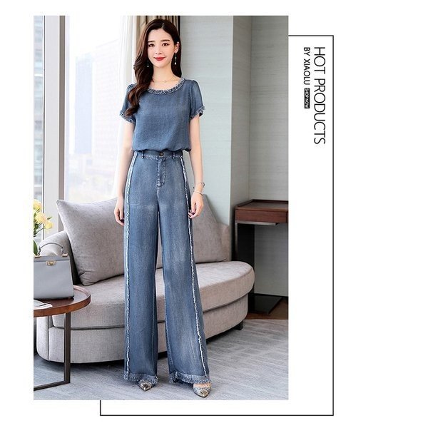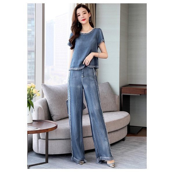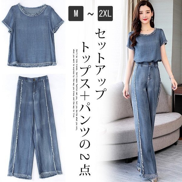 セットアップ レディース ワイドパンツ 夏 2点セット デニム パンツドレス カジュアル ガウチョパンツ 入学式 入園式 通勤