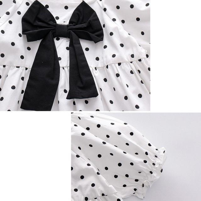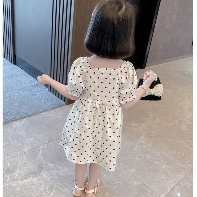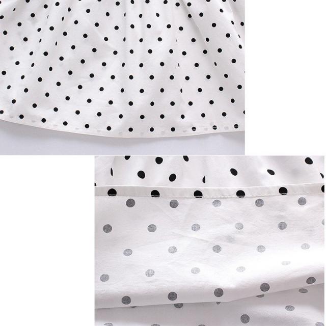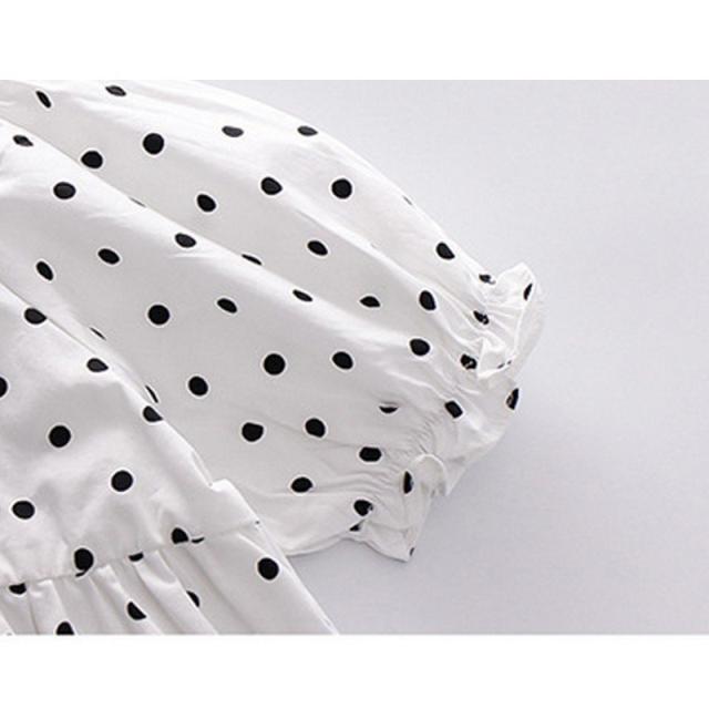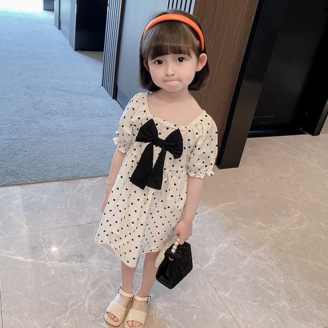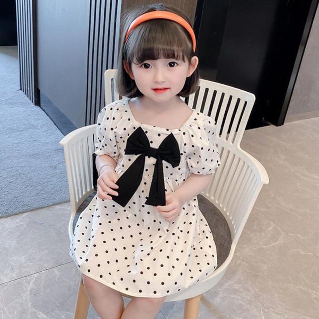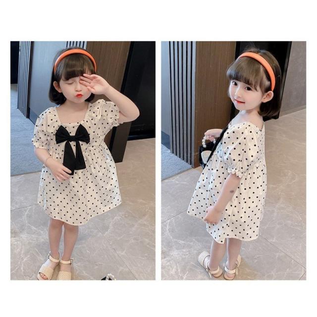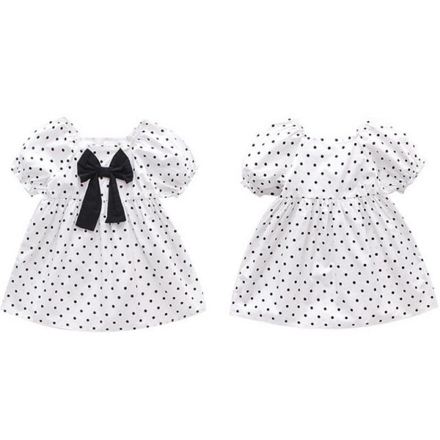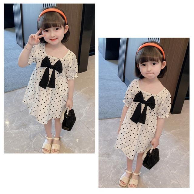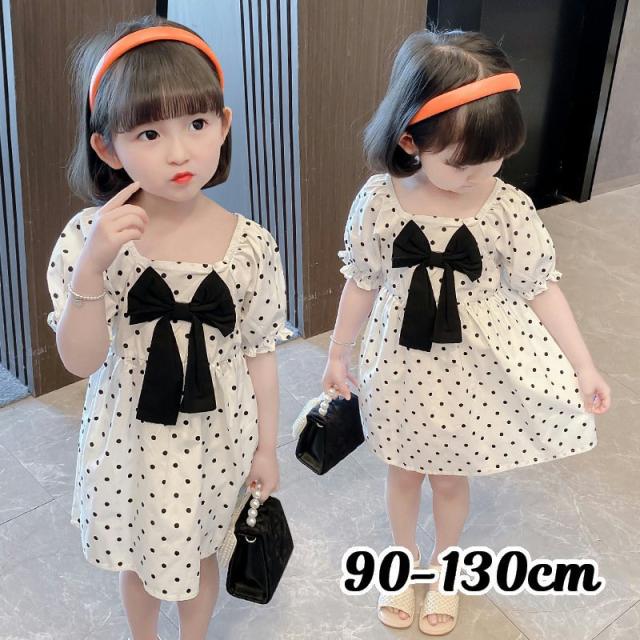 ワンピース 子供服 キッズ 女の子 カジュアルドレス 半袖 スクエアネック リボン パフスリーブ 袖口ゴム ドット柄 水玉 ギャザー 膝丈 かわいい