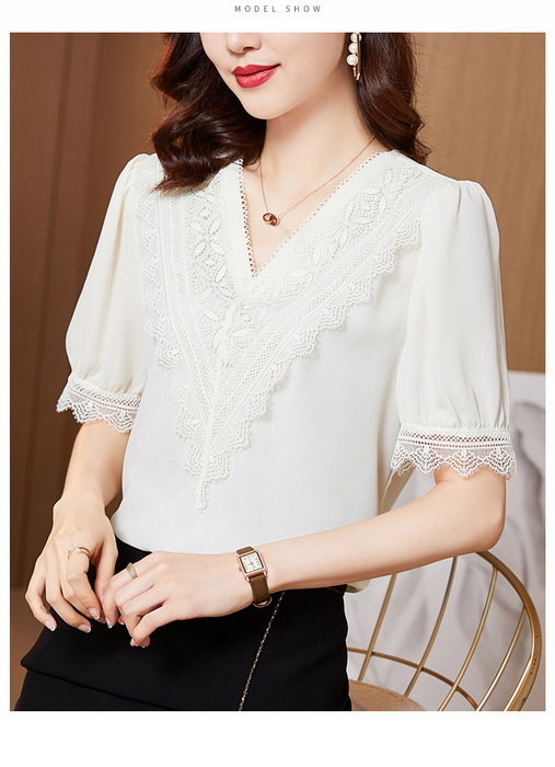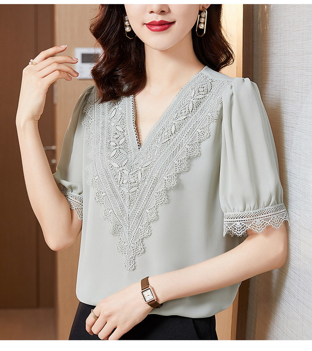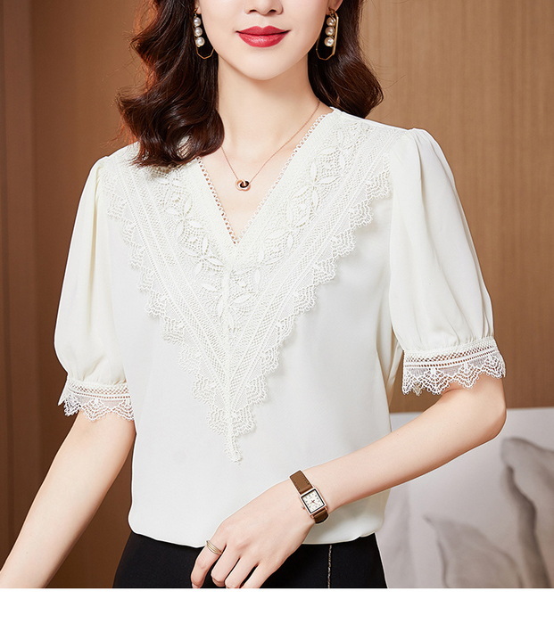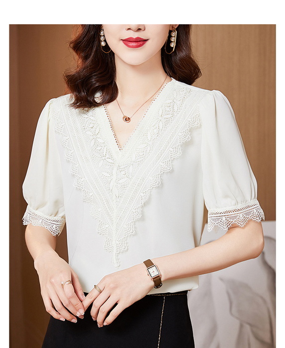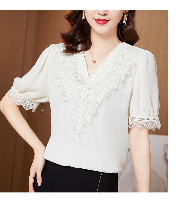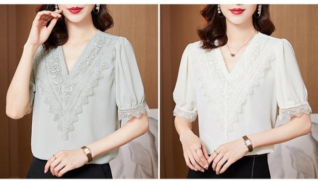 ブラウス レディース 40代 春夏新作 オシャレブラウス シフォンブラウス レースVネック パフスリーブブラウス 五分袖トップス 通勤 ゆったりtシャツ 30代50代
