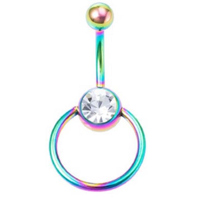 虹色レインボウにメッキしたカラフルなキャプティブビーズリングとバナナバーベルを合体させたユニークな臍ピアス。